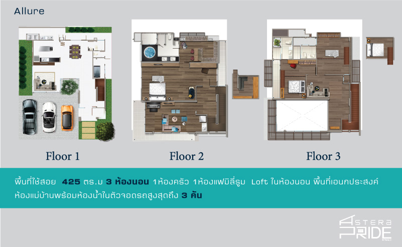 พื้นที่ใช้สอย 425 ตร.ม 3 ห้องนอน 1ห้องครัว 1ห้องแฟมิลี่รูม Loft ในห้องนอน พื้นที่เอนกประสงค์ ห้องแม่บ้านพร้อมห้องน้ำในตัวจอดรถสูงสุดถึง 3 คัน