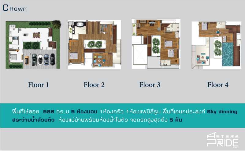 พื้นที่ใช้สอย 586 ตร.ม 5 ห้องนอน 1ห้องครัว 1ห้องแฟมิลี่รูม พื้นที่เอนกประสงค์ Sky dinning สระว่ายน้ำส่วนตัว ห้องแม่บ้านพร้อมห้องน้ำในตัว จอดรถสูงสุดถึง 5 คัน