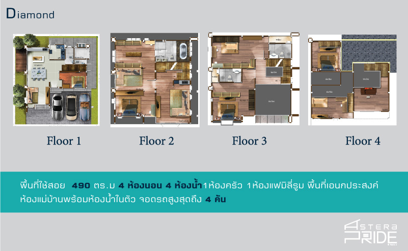 พื้นที่ใช้สอย 490 ตร.ม 4 ห้องนอน 4 ห้องน้ำ1ห้องครัว 1ห้องแฟมิลี่รูม พื้นที่เอนกประสงค์